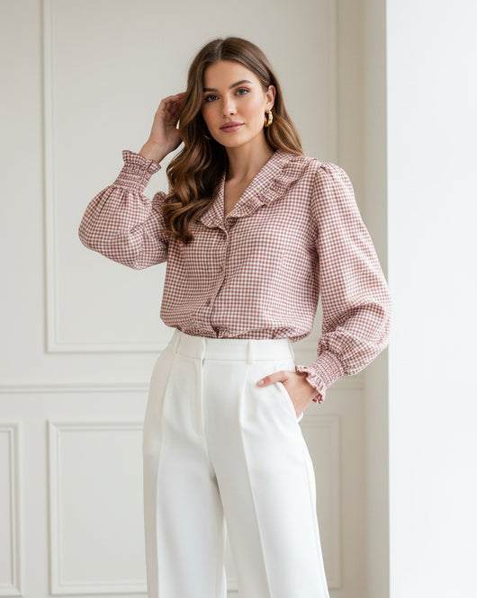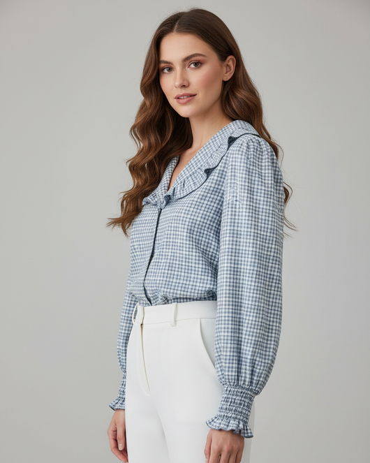 Camisa vichy com folhos no decote em V e punhos com franzido
