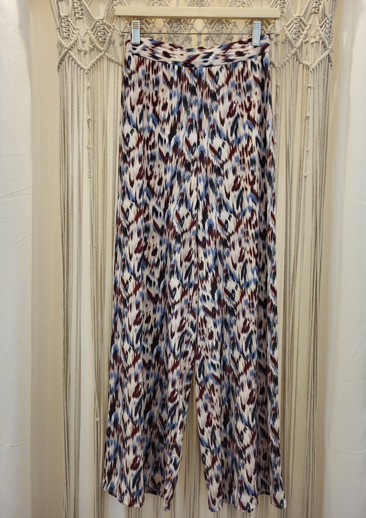 Calças de malha fria estampadas em tons de azul e castanho