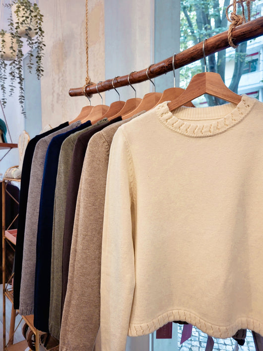 Camisola de decote redondo de tacto suave, com pormenores na gola, punhos e bainha
